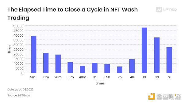 为什么一天内的闭环交易也是一个小高点呢?研究发现,这些项目中的刷单交易呈现一种特征:通常由某个地址,在一天内将自己资产中的所有NFT交易一次(这个数量通常比较大,量级达到几千上万),并在之后一天交易回来形成闭环。因为NFT的基数够大,所以这种看似“迟缓”的刷单交易往往能产生巨大的交易量,进而产生市场繁荣的虚假景象。
