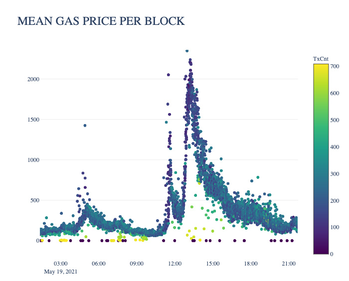5 月 19 日世界标准时间 11:00 左右,以太坊平均 Gas 价格在不到两个小时的时间内突然从低于 100 GWEI 飙升至超过 2,000 GWEI,然后又在几个小时后下降到大约 300 GWEI。