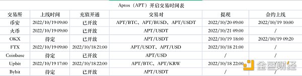 10月18日,公链项目Aptos官方宣布正式启动主网Aptos Autumn。随后Coinbase、币安、FTX、Huobi Global、OKX等各大交易所均宣布将上线Aptos代币APT。各个交易所上线时间明细如表: