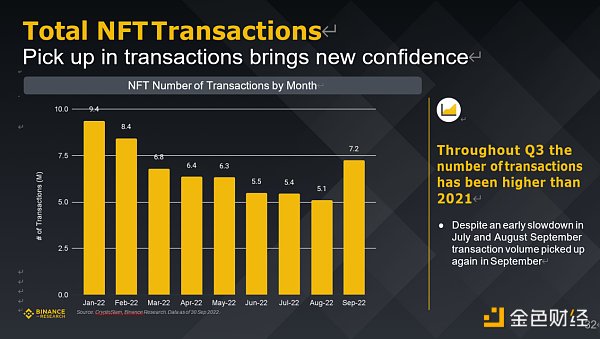根据截至2022年9月30日CryptoSlam和BinanceResearch的数据显示,尽管7月-9月的NFT交易量有所放缓,但9月交易量再次回升,与2021年同期相比,整个三季度的NFT交易数量有所增加,而交易量的增加重振了市场信心。