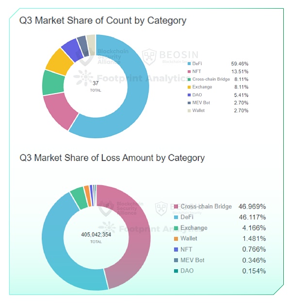 2022年第三季度,3次跨链桥攻击事件共造成约1亿9025万美元的损失;22次DeFi领域的攻击事件共损失1亿8679万美元。约92%的攻击损失金额来自跨链桥和DeFi项目。