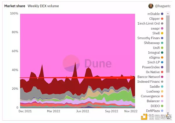因此 DeFi 在近期又重回人们的视野。我们看到在近期,DEX/CEX 现货交易量之比稳定在了 15%,相对于年初牛市时回落了 40% 左右,毕竟现在深熊,整体链上活跃度很差。但现在从链上交易量来看,61% 来自 Uni,27% 来自 Curve,9% 来自 Dodo。从衍生品交易价格的投喂来自 Dex,衍生品交易的流动性来自于 Dex 等角度来看,现在 DEX 更像是整个 DeFi 的基础设施。虽然 Dex 模型在不断创新,但不可否认的事实是 Uni 的市占比在今年一直稳定在 70% 左右。这可能来源于用户/链上做市商/trading bot 交易路径的依赖以及 uni 的深度优势。