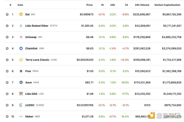 DeFi项目锁定资产前十排名及锁仓量 数据来源:defillama