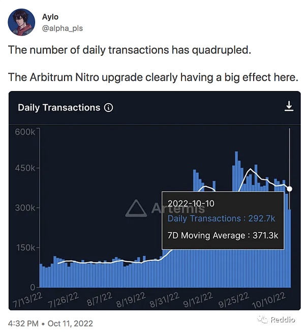Arbitrum 已经发布了他们的旗舰升级产品:Nitro。截至目前,他们在任何通用 Rollup 中获得了最多的采用。尽管目前处于熊市,但 Arbitrum 网络的每日交易数已增长了 4 倍,日活跃用户数翻了一番。