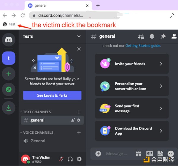 现在的浏览器都有自带的书签管理器,在提供便利的同时却也容易被攻击者利用。通过精心构造恶意的钓鱼页面可以让你收藏的书签中插入一段 JavaScript 代码,有了这个几乎可以做任何事情,包括通过 Discord 封装好的 webpackChunkdiscord_app 前端包进行信息获取。当 Discord 用户点击时,恶意 JavaScript 代码就会在用户所在的 Discord 域内执行,盗取 Discord Token,攻击者获得项目方的 Discord Token 后就可以直接自动化接管项目方的 Discord 账户相关权限。攻击者拿到了 Token 等同于登录了 Discord 账号,可以做登录 Discord 的任何同等操作,比如建立一个 Discord webhook 机器人,在频道里发布公告等虚假消息进行钓鱼。下面是演示受害者点击了钓鱼的书签: