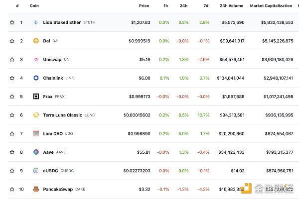 DeFi项目锁定资产前十排名及锁仓量 数据来源:defillama