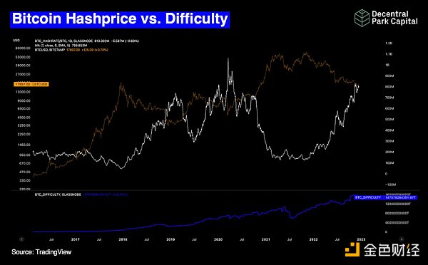 内容:比特币不断上涨的哈希价格(哈希率 / 价格)与受抑制的 BTC/USD 比率以及不断攀升的挖矿难度。