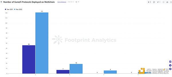 3. 2021 年有 63 个区块链游戏部署在 2 或 3 条链上,而 2022 年有 149 个区块链游戏选择了多条链。