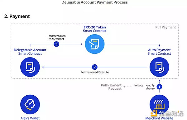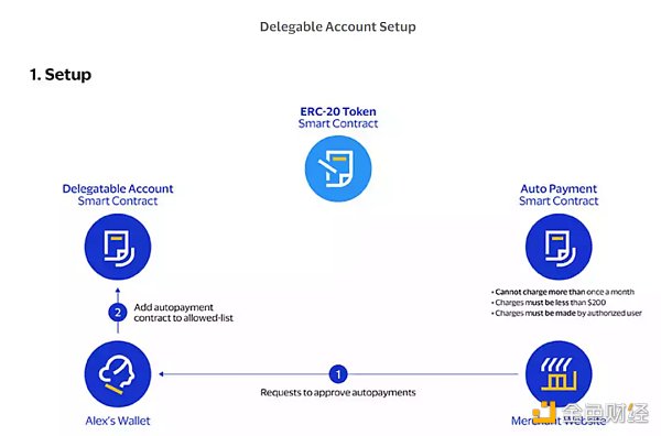 首先,商户需要部署自动支付智能合约。当拥有可委托账户的用户访问商家网站时,他们将看到批准自动支付的请求——类似于 Visa 接受的账单。此时,用户可以看到自动支付合约将以用户的名义执行操作,其中能够按照用户需要设定参数,比如每月只能向用户收费一次、收费不能超过设定的最大金额等。最重要的是,由于这是一个智能合约,用户可以确信自动支付合约不会以其他方式被执行。