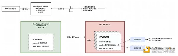 注册器合约(绿色部分):负责分配名称的合约,有正向注册器,反向注册器,DNS 注册器。