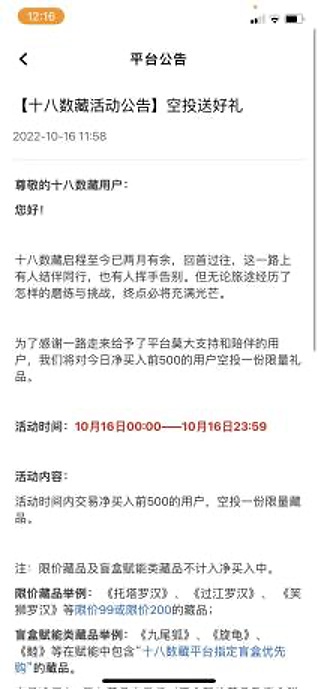 10月16日中午,十八数藏发布平台公告称要对在10月16日0点-24点之间净买入前500名的用户进行空投奖励。17日18:49又修改公告,将前500同样的礼品分出了4个等级。有用户提出质疑: