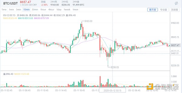 5月12日凌晨03:23,BTC完成第三次减半,区块奖励由12.5 BTC降至6.25 BTC。减半前后,BTC价格虽有波动,但与人们期待的上涨行情完全不符。根据今日的价格走势,凌晨BTC快速下跌,波动区间为8900-8200,07:00之后,BTC在8700美元附近横盘整理。