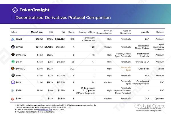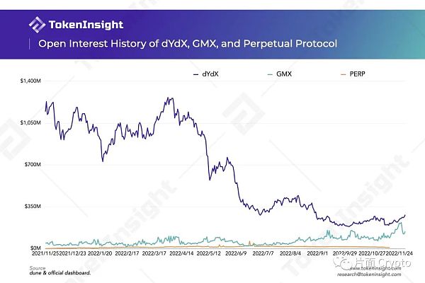 dYdX 在 2022 年 Q3 以前处于去中心化交易所的龙头地位,但是在 Q3 之后交易量方面有被 GMX 超越的迹象;在平台收入方面部分时候已经被 GMX 超越,而 TVL 方面 GMX 已经排名第一