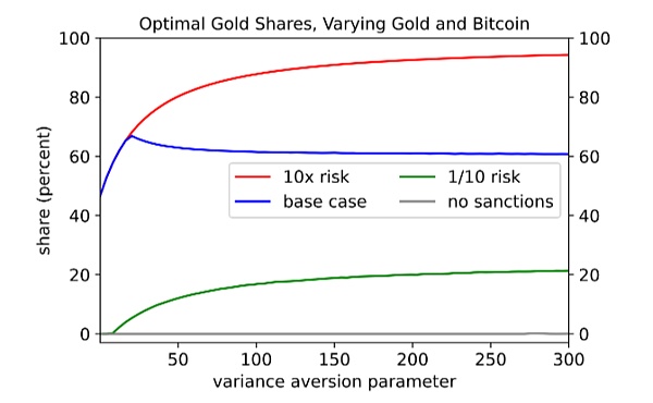 在第三种模型中,当面临非常高的制裁风险时,央行持有的 BTC 可能高达其投资组合的 40% 。