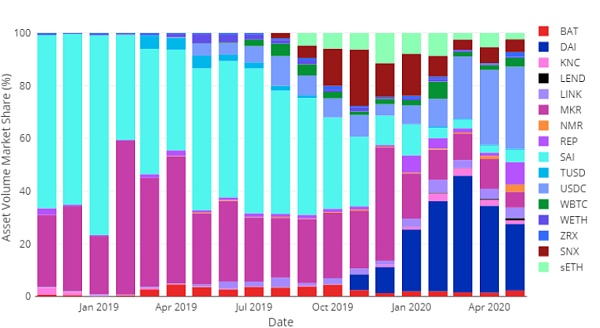 DAI、USDC和MKR市场仍占交易活动的大部分。在4月份,仅这三种资产的交易量就约占全部交易量的72%。