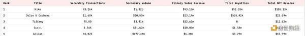 Dune Analytics 的数据显示,耐克去年在 Web3 产品上获得了至少 1.85 亿美元的收入,其中 9300 万美元来自销售,9200 万美元来自版税收入。对比阿迪达斯的 1100 万美元和彪马的 130 万美元,耐克已经赢麻了,它也是 NFT 销售获利最多的品牌。
