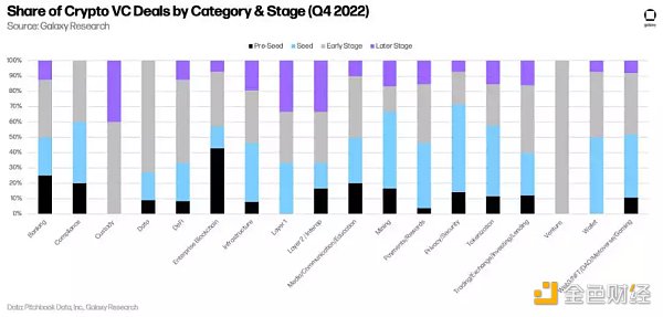 种子前的投资交易连续多年下滑。2022 年第四季度,后期投资交易数量首次超过种子前交易数量,这种趋势凸显了加密行业的成熟,但也预示着未来新公司会越来越少,新产品也会越来越少。