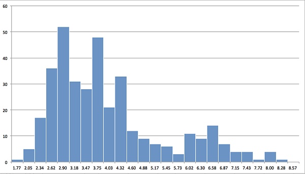 由于对于收益计算、标准差等统计描述数据没有统一的标准,为了简单表达趋势和主要思路,我们仅用价格做分布。根据近一年收盘价数据我们得出主要的统计描述数据为:标准差:1.41均值:3.87中值(中位数):3.56众数:3.70最大值:8.57最小值:1.77极差:6.80分组数:24组距:0.28根据各分组情况我们画出数据直方图: