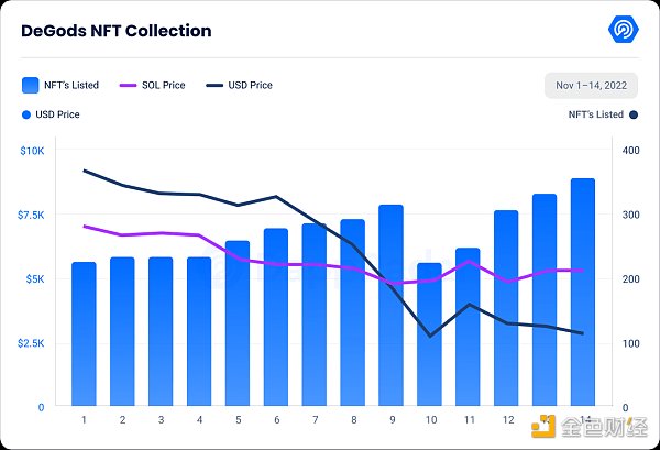 自 11 月 1 日以来,Solana 的 NFT 交易量增长了 380%,NFT 销售量增长了 396%。值得注意的是,自 11 月 1 日以来,领先的 NFT 系列 DeGods 的底价以 SOL 计算下降了 24.01%,以美元计算下降了 69.11%。此外,上市 NFT 的数量增加了 58.04%。
