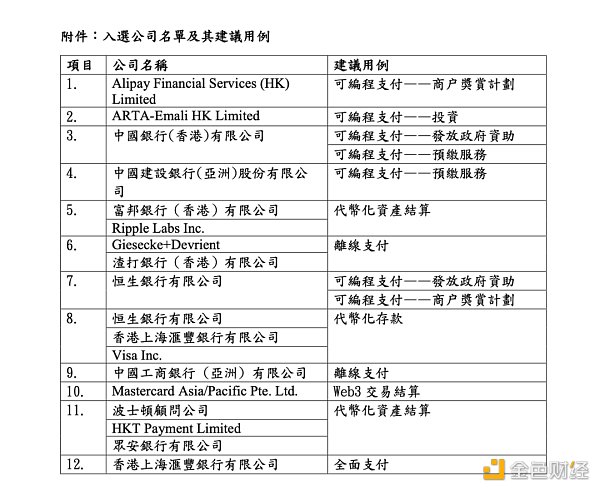 图:入选数码港元先导计划的公司名单及建议用例