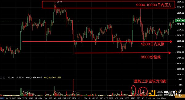 大盘近期偏整理走势,震荡区间变窄,由之前的9200-10000美金区间,转为9500-10000美金区间内随机震动。昨天下午4点短时放量拉升,从低点再次上攻冲击1万美金,随后一个天地针再次回撤到9500美金底部。日内盘面支撑9500-9600美金区间,压力9800-10000美金区间,量能没有明显的放大前,区间盘整的走势延续。