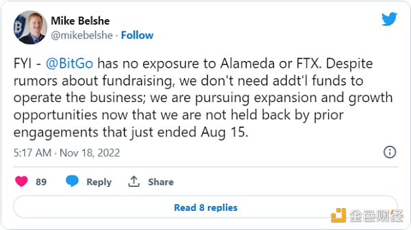 在调查 BitGo 的时候,首先看到的就 Mike belshe(BitGo CEO)的推文,虽然他表示 BitGo「没有 Alameda 或 FTX 风险敞口」,但是他们现在却忙着筹集资金去了,这令人诧异!