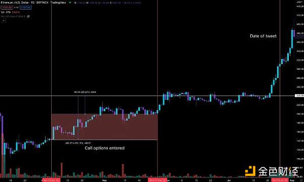 但请记住,Zhu 持有一些 7 月份的 ETH 看涨期权。它们的行权价为 240 ,每张合约的成本为 0.0246 ETH。