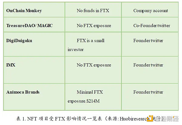 鉴于BAYC系列受到FTX余波的影响,我们跟踪了目前NFT市场上的一些知名项目,目前来看仍有部分NFT项目受到了影响。具体是否受FTX事件影响和影响的程度见下表所示。