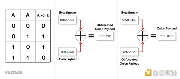 然后,Alice 使用 rho key 创建一个随机字节串,并对上一步得到的洋葱负载使用异或(XOR)运算,得到混淆后的负载。负载的原文可以通过对混淆文使用这个随机字节串的 XOR 运算得到(译者注:换言之,这里的 XOR 就是对称加密的算法,而随机字节串就是密钥)。XOR 操作会逐比特对比洋葱负载和(由 rho key 生成的)随机字节串,仅当其中一个数据的比特是 1 时,才会输出 1;这就得出了一个混淆后的负载。XOR 操作巧妙的地方在于,只要你得到了对的那个随机字节串以及混淆后的负载,只需用两者再次运行 XOR 操作,就可以得到混淆之前的负载。