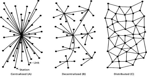 如图1所示,星型的中心化系统有一个中心节点或服务器,连接所有其他用户,中心节点储存其他用户可以访问的数据以及用户信息,用户可以通过访问中心节点而获取数据,也可以通过访问中心节点与其他用户取得联系。拓展星型的去中心化的网络则有若干核心节点,对于周围的若干用户来说,这些核心节点类似中心服务器,但这些核心节点又相互连接。而所谓网型分布式结构则是完全扁平化的,它不仅没有星型网络中的中心节点,也没拓展星型的核心节点,在这一网络结构中,所有的终端用户都处于平等地位。巴兰主张,阿帕网应当采取第三种分布式结构,这一结构再加上将数据切割打包的分组交换等技术,可以实现数据传输的强大生存能力。在巴伦的设计主张中,每个节点至少与周围四个节点形成连接,即使一半的节点被摧毁,连接的冗余也仍可以保证其他节点之间的自由通信。在巴兰的影响下,分布式网络成为了早期互联网的基础性架构。