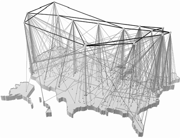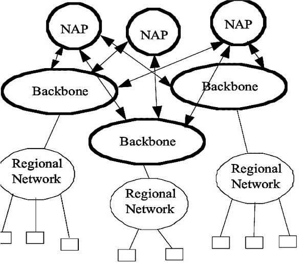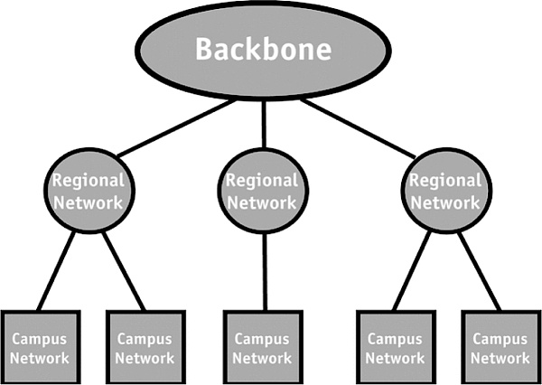在阿帕网之后,互联网的中心化与去中心化继续呈现复杂性,并且继续受到与法律的影响。20世纪80年代中期,美国国家科学基金会(NSF)开始部署NSFNET,并由联邦政府而非军方提供资金资助,以实现互联网的更有效连接。到了20世纪90年代,NSFNET替代阿帕网,成为互联网的骨干网络,并奠定了今天世界范围内互联网络的基础。从图2可以看出,当时的NSFNET的骨干网采取了类似阿帕网的低密度互联结构,但其最上层骨干网节点的互联密度并不高,每个节点平均只有2—3个链路。而在纵向结构方面,其采取的是纵向树型结构,类似星型结构的延展。如图3所示,整个网络系统由主干网、地区网和校园网组成。各大学的主机可连接到本校的校园网,校园网可就近连接到地区网,每个地区网又连接到主干网,主干网再通过高速通信线路与阿帕网连接。NSFNET之所以采取这种横向的低密度分布式网状结构和纵向的拓展星型结构,是因为其主要的与法律目标就是科研机构的有效互联,而非军事上的通信生存能力。NSFNET的这种结构虽然可能会因为某个节点故障而导致部分网络中断,但其通信效率较高。这一结构可以用较少的链路连接所有节点,而且由于任何两个节点之间只存在一条路径,因此数据的传输路径非常明确简单。