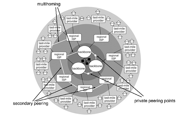 互联网的底层架构中的中心化与去中心化也不断演进。随着NSFNET在20世纪90年代中期转向了商业化应用,互联网在维持三层树状结构的同时,每一层级和不同层级间也出现互联,从而增强了其网状或分布式结构的特征。一方面,商业化后的互联网仍然大致维持了NSFNET的架构,只不过其校园网被本地网络服务提供商(ISP)所取代,地区网演变为私人网络服务提供商所服务的网络,骨干网则逐渐向私人网络服务提供商开放,并最终为私人骨干网所代替。如图4所示,商业化互联网下的骨干网—地区网—本地网仍然采取树状结构。另一方面,商业化的互联网引入了更多的数据互联链路。在骨干网方面,NSFNET骨干网的节点和信息高速公路非常有限,私有化骨干网的引入大大增加了骨干网的节点和链路。起初,NSF在旧金山、芝加哥、纽约和华盛顿特区建立了四个网络接入点 (NAP)(如图4所示),以保证不同商业网络的数据交换。其后,随着私人骨干网的节点和链路越来越多,整个骨干网就呈现了一种高度互联的网状结构,类似于图5所示的同心圆树状结构。尽管这种结构在骨干网—区域网网络服务提供商—本地服务商的结构方面仍然是树状的,但骨干网之间已经互联为一个同心圆结构。同时,随着私人骨干网的发展,这种互联结构进一步加强。如图5所示,除了NSF建立的网络接入点,私人骨干网之间也建立起了数据私有对等交换点。除了骨干网,其他网络服务商的互联也大大增加。例如在不同区域网的网络服务提供商之间,商业互联网逐渐建立了数据二级交换点;在多宿主结构中,在骨干网和区域网网络服务提供商之间,以及在本地网络服务商和区域网网络服务提供商之间,也逐渐建立了更多连接。