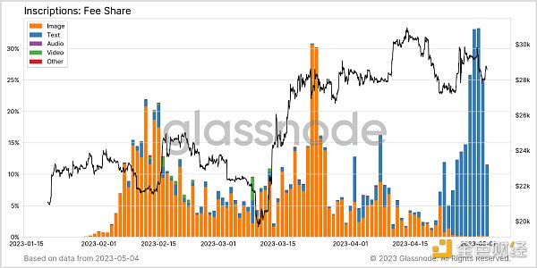 将与文本铭文相关的交易从所有交易中分离出来,可以清楚地看到,它们是最近比特币活动增加的唯一驱动因素,甚至在很短的时间内超过了所有其他交易数的总和。
