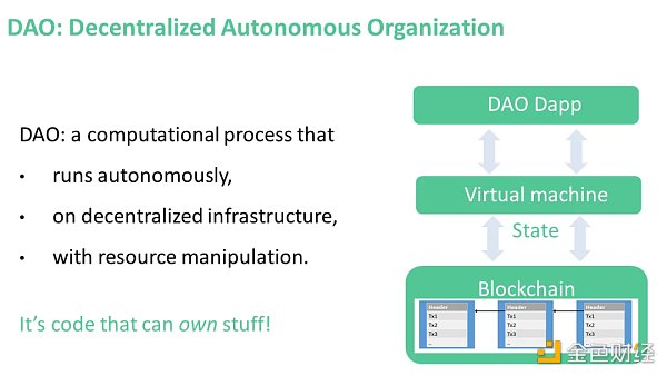 DAO 是一种能够拥有财产的自治代码,类似于一种“电脑病”,但是是有益的。比特币是 DAO,以太坊也是 DAO。在以太坊上运行的越来越多的自治应用程序也是 DAO。