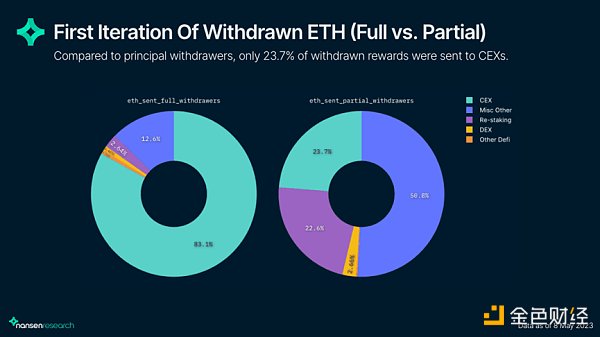 上面的图表显示了被提取的 ETH 被发送到哪里的第一次迭代的细分,这让人们了解了提款者用他们的 ETH 做了什么,并有助于衡量提款者立即或短期内的一些抛售压力。
