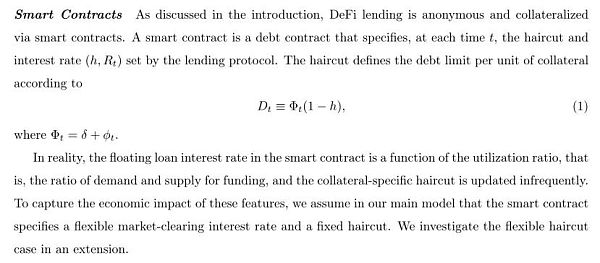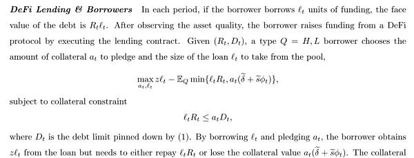 在本文的模型中,借款人希望通过一个贷款平台,使用他们持有的加密资产作为抵押品,从贷款人那里借入资金(例如稳定币)。在借款人和贷款人之间,关于资产质量的信息是不对称的。那些私下被告知他们的加密资产质量较低的借款人,比那些私下被告知他们的加密资产质量较高的借款人,有更强的借款动机。贷款人无法直接控制抵押品组合,因此这种信息摩擦导致了经典的柠檬问题,并可能通过驱逐优质借款人而严重减少贸易收益,DeFi平台对加密资产进行了“剪发” (haircut) ,这降低了贷款的信息敏感性,并缓解了逆向选择问题。
