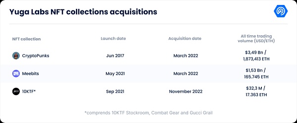 Yuga Labs 于 2021 年 3 月从 Larva Labs 手中收购了 CryptoPunks 和 Meebits 的 IP,当时成为了头条新闻。此次收购大幅提高了 Yuga Labs 在 NFT 行业中的影响力,因为这两个 NFT 项目当时的估值为 24.2 亿美元和 3.7 亿美元。因此,在收购后,到 2022 年 3 月底,Yuga Labs 的 NFT 版图的估值增至 81 亿美元,占以太坊前 100 个 NFT 项目的 42.6%。
