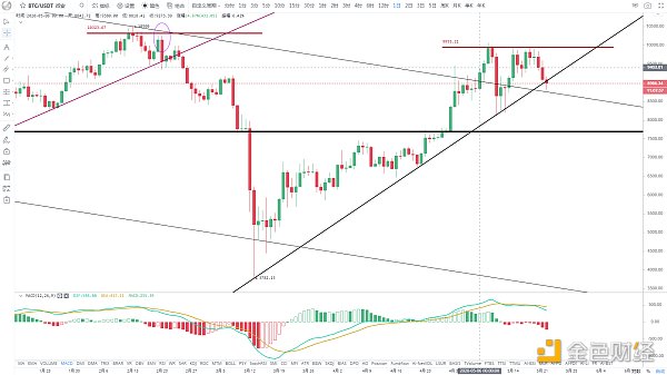 前期1万美金附近横盘震荡许久,迟迟不能上行突破,近期价格持续走弱,日线接连收阴,短短时间内价格便跌去了将近1000美金,昨日晚间更是跌破20日均线支撑和14000-10500的下降转支撑趋势线,而后价格出现快速回落,最低跌至8818美金在回升,这个位置是30日均线和14000下来的斐波那锲0.5支撑区域,存在一定的多头撑盘,前期一直维持的楔形三角也已跌破,上涨趋势已走坏,日线MACD指标线死叉向下发散,空头量柱0轴下方逐步增强,空头势力明显占据优势,综合来看后续整体将维持一个震荡下跌的局面。