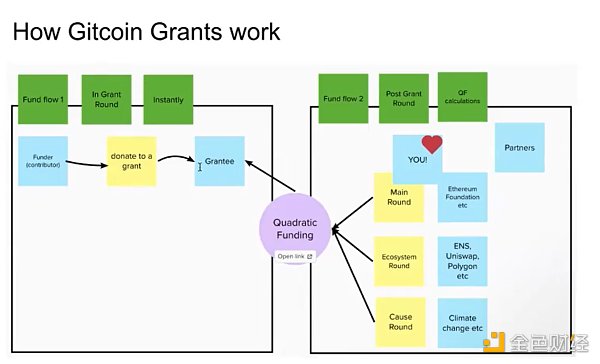 Grantees 从 Gitcoin 当中获取的资金支持分两部分,一部分是 Funders 的直接捐款,资金会直接发送 Grantees 的钱包;另外一部分来自 Matching Partner 的捐款池。每一轮 Grants 都会通过算法来进行资金分配,Grants 结束后, 项目方根据分配结果获得资金。