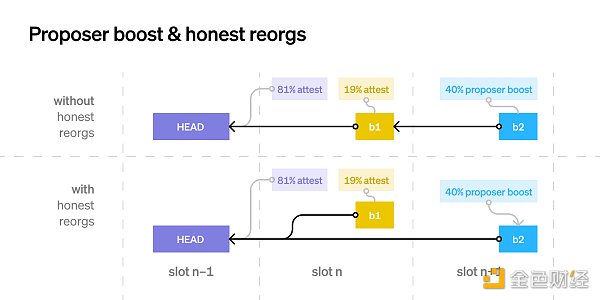 如果没有诚实的重新组织,在第 n+ 1 个时隙中提议者将 b 1 视为链头并构建子区块 b 2 。尽管它只有 19 %的证明权重,但提议者不会努力重新组织 b 1 。在第 n+ 1 个时隙期间,b 2 具有提议者增强功能,并且假设它按时交付,则通过积累该时隙大部分认证而成为规范。