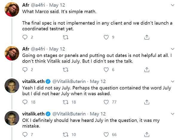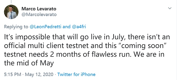 “(Eth2.0) 不可能在7月份上线,因为还没有上线正式的 (联合) 测试网,而这个‘即将到来的’正式测试网需要无瑕疵地运行至少2个月。而我们现在已经是5月中旬了。”