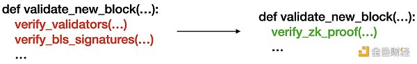 上述验证方法是原生验证的通用方案,但是在链上直接验证源链共识涉及到大量的链上数据验证与计算,Gas消耗高。而使用ZKP技术,在链下完成源链数据的计算与验证,并生成简洁的源链共识传递到目标链可以大大降低链上Gas消耗,这也是为什么基于ZKP的链上轻客户端可以廉价验证源链共识。基于ZKP的跨链协议将聚合公钥验证BLS签名的过程放在链下,并生成ZKP证明,目标链客户端只需要验证一个零知识证明就可以验证源链共识。具体代码如图1 所示。
