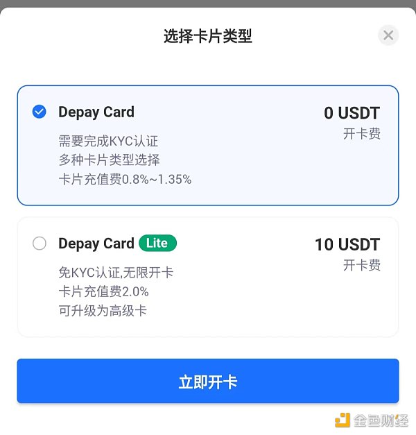 Depay选择不同等级的卡,其充值手续费不同,记者选择了无需开卡费,但是手续费相对高的最低等级的卡。