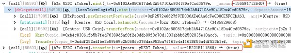 5. 接下来攻击者使用15万USD兑换了15万的bZx USDC iToken,并将其发送给了yearn: yUSDT Token合约,此时,合约中有118万的资金,攻击者拥有90/103的份额,也就是能提取103万资金。