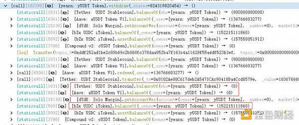 7. 随后,攻击者调用yearn: yUSDT Token合约的rebalance函数,该函数会将当前池子的代币提取出来,并质押到另一个收益更高的池子中,由于第2步操作,合约会将USDT和USDC提取出来,添加到收益更高的池子中,但当前合约仅有bZx USDC iToken,也只能提取出USDC,提取出来后将复投到其他USDT池子,此时复投将跳过。