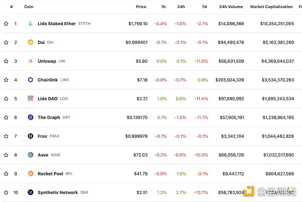 DeFi项目锁定资产前十排名及锁仓量 数据来源:defillama