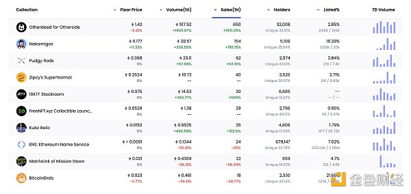 24小时NFT交易量、交易量前十项目 数据来源:Coinmarketcap