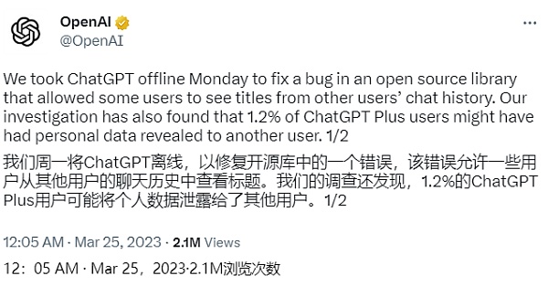 美国时间3月25日,OpenAI官方发布了3月20日ChatGPT临时中断服务的调查报告,并表示有1.2%的ChatGPT Plus用户可能数据被泄露。