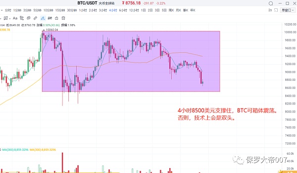 BTC 4小时看, 8500美元是一个关键位置。为什么?如果8500跌破了,BTC日线就有可能形成双顶!(这个点位千万不可跌破,则大饼还可以8500为支撑箱体震荡。希望主力留点情。)