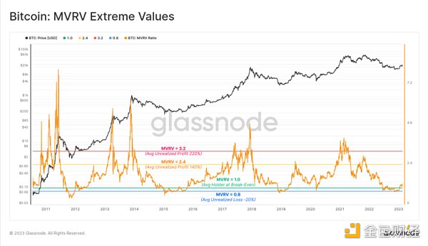 1.探索 MVRV 的极值以发现周期顶点和低点。